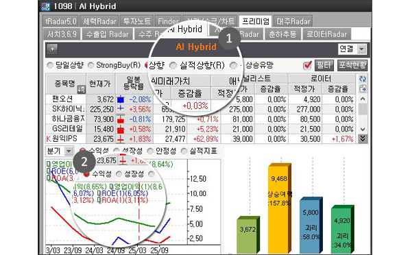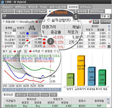 종목을 제공하는 서비스입니다. - Point 2 AI-Hybrid Radar>상승유망종목에서는 현재가격과