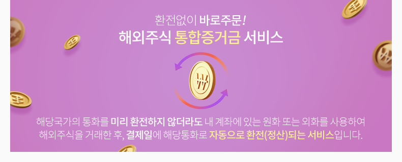 해당국가의 통화를 미리 환전하지 않더라도 내 계좌에 있는 원화 또는 외화를 사용하여 해외주식을 거래한 후, 결제일에 해당통화로 자동으로 환전(정산)되는 서비스입니다.