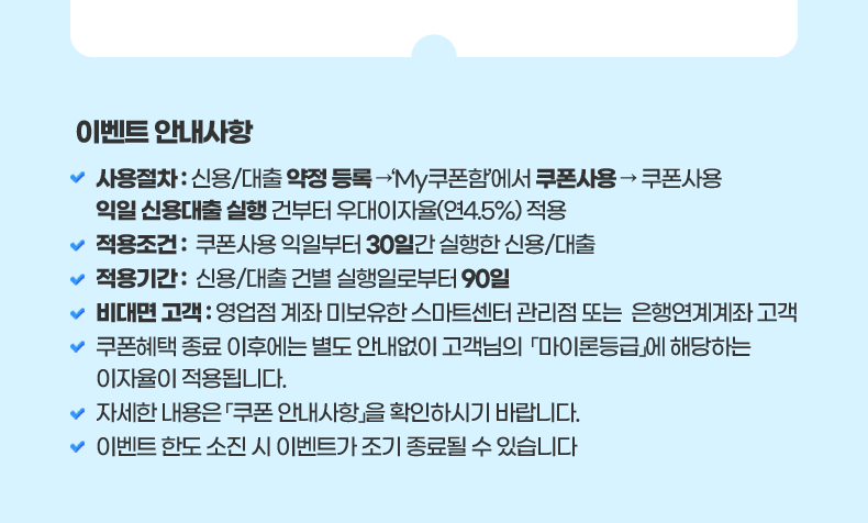 - 적용기간 : 쿠폰 사용 후 실행한 신용/대출의 건별 실행일로부터 90일간(비영업일 포함)