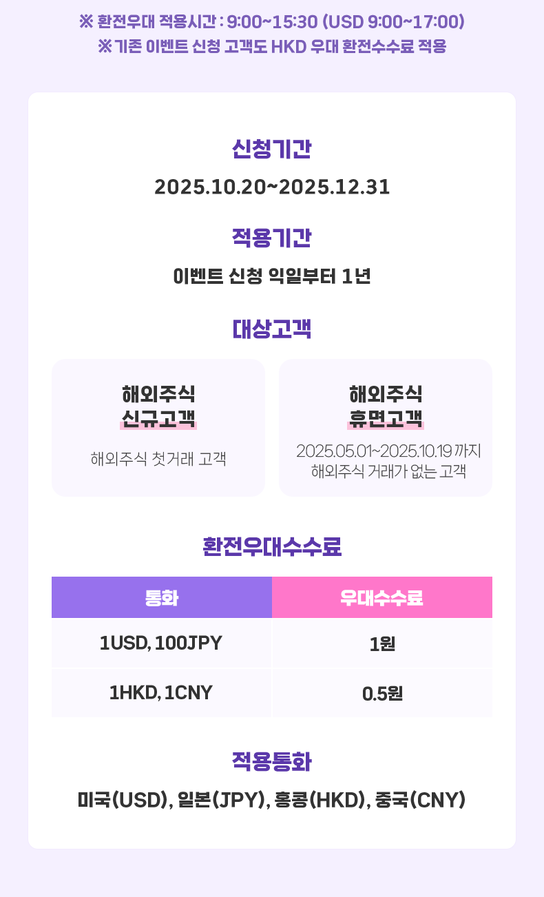 - 1. 해외주식 신규고객 (해외주식 첫거래 고객) / 2.해외주식 휴면고객 (2025.05.01~2025.10.19 까지 해외주식 거래가 없는 고객)