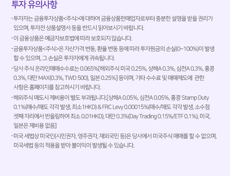 - 미국 세법상 미국인(시민권자, 영주권자, 재외국민 등)은 당사에서 미국주식 매매를 할 수 없으며, 미국세법 등의 적용을 받아 불이익이 발생될 수 있습니다.