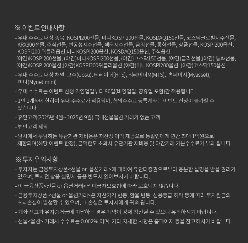 - 우대 수수료 대상 종목: KOSPI200선물, 미니KOSPI200선물, KOSDAQ150선물, 코스닥글로벌지수선물, KRX300선물, 주식선물, 변동성지수선물, 섹터지수선물, 금리선물, 통화선물, 상품선물, KOSPI200옵션, KOSPI200 위클리옵션,미니KOSPI200옵션, KOSDAQ150옵션, 주식옵션 (야간)KOSPI200선물, (야간)미니KOSPI200선물, (야간)코스닥150선물, (야간)금리선물,(야간) 통화선물, (야간)KOSPI200옵션,(야간)KOSPI200위클리옵션,(야간)미니KOSPI200옵션, (야간)코스닥150옵션
