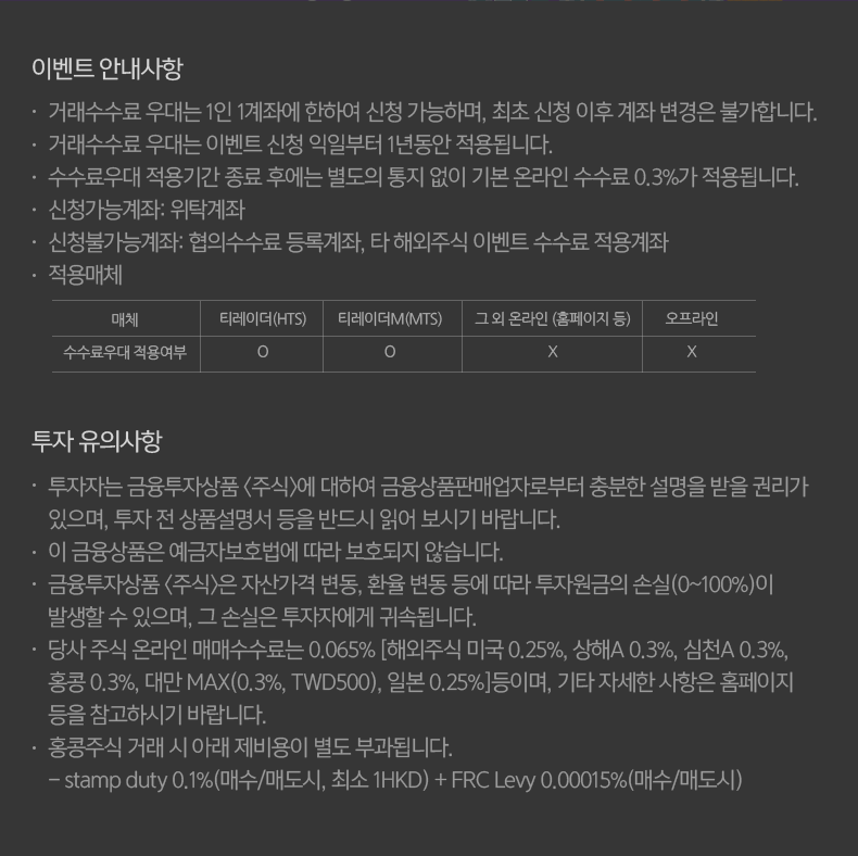 - 적용매체 : 수수료우대 적용 매체 - 티레이더(HTS), 티레이더M(MTS), 티레이더M NEW(MTS) / 수수료우대 미적용 매체 - 그 외 온라인(홈페이지 등), 오프라인