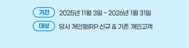 - 이벤트 기간(25.11.03~26.01.31) 내 주민번호 기준 당사에서 개인형IRP계좌를 최초 개설한 고객 대상입니다.