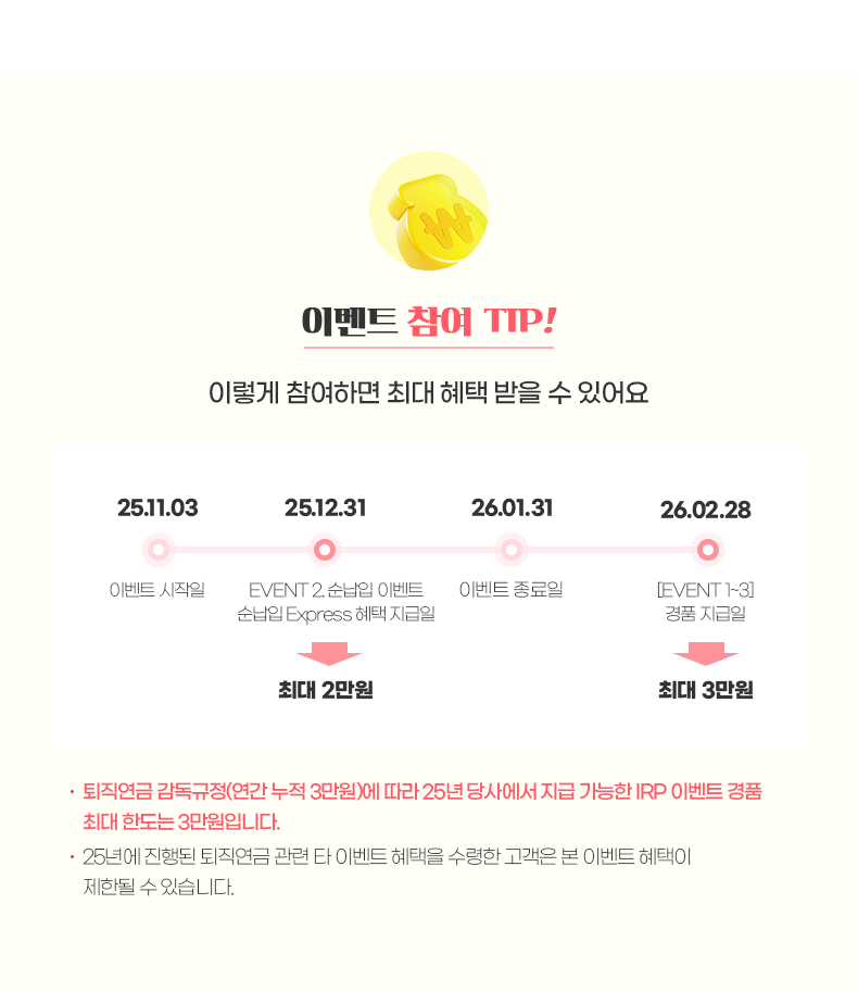 - 퇴직연금 감독규정(연간 누적 3만원)에 따라 25년 당사에서 지급 가능한 IRP 이벤트 경품 최대 한도는 3만원입니다.