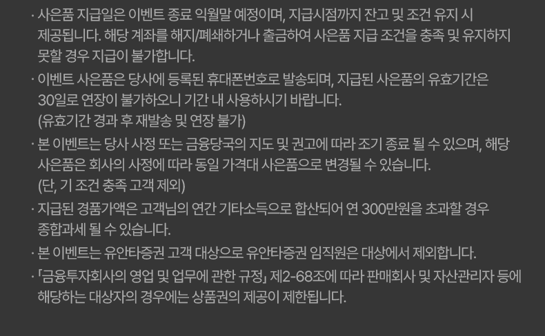 - 본 이벤트는 당사 사정 또는 금융당국의 지도 및 권고에 따라 조기 종료 될 수 있으며, 해당 사은품은 회사의 사정에 따라 동일 가격대 사은품으로 변경될 수 있습니다. (단, 기 조건 충족 고객 제외)