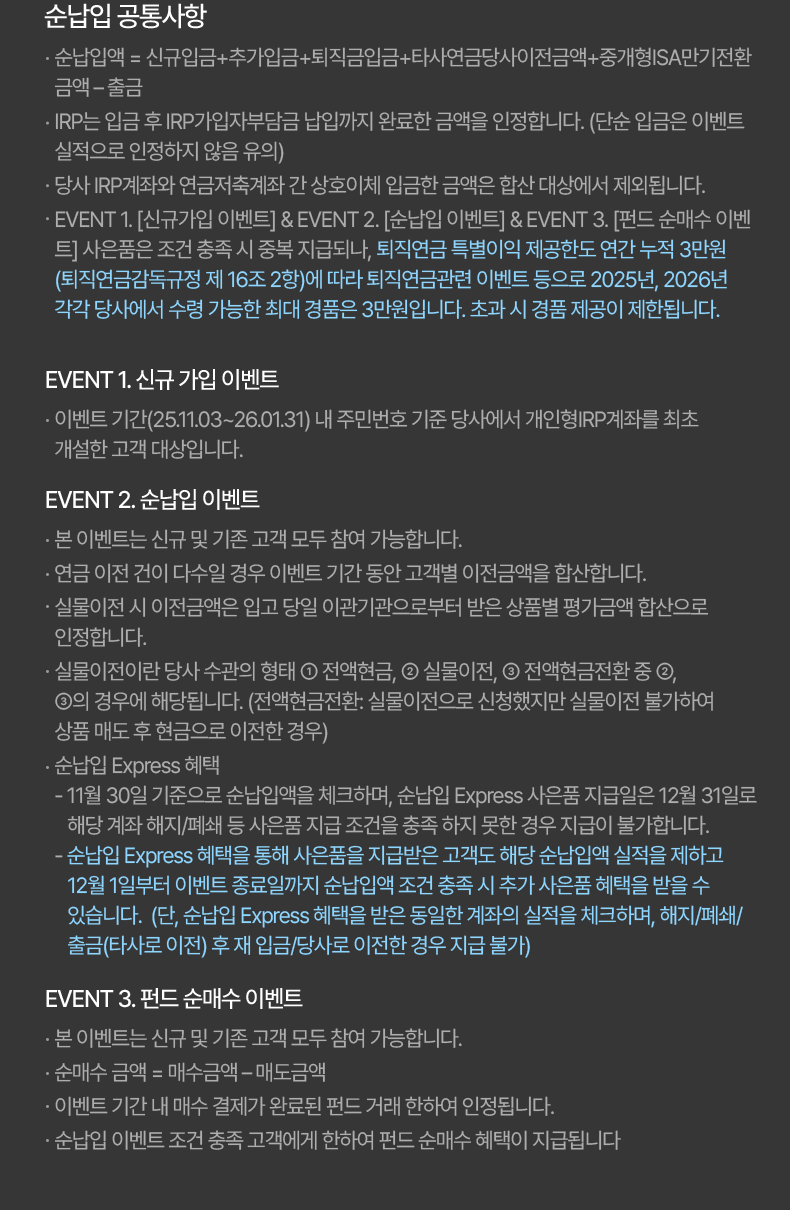 - EVENT 1. [신규가입 이벤트] & EVENT 2. [순납입 이벤트] & EVENT 3. [펀드 순매수 이벤트] 사은품은 조건 충족 시 중복 지급되나, 퇴직연금 특별이익 제공한도 연간 누적 3만원 (퇴직연금감독규정 제 16조 2항)에 따라 퇴직연금관련 이벤트 등으로 2025년, 2026년 각각 당사에서 수령 가능한 최대 경품은 3만원입니다. 초과 시 경품 제공이 제한됩니다.