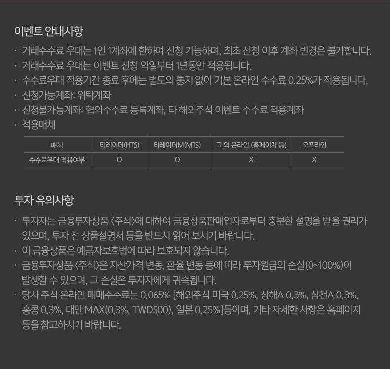 - 신청불가능계좌: 협의수수료 등록계좌, 타 해외주식 이벤트 수수료 적용계좌