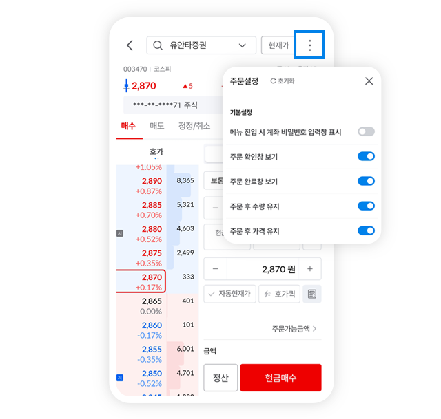 - ※ 영업점 일반고객 수수료는 온라인(HTS) 0.064%~0.065%, 모바일(MTS) 0.099%~0.1% 등(NXT, KRX 포함)이며, 기타 자세한 사항은 홈페이지를 참고하시기 바랍니다.
