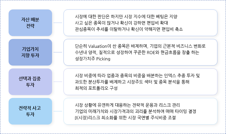 • 전략적 사고 투자 : 시장 상황에 유연하게 대응하는 전략적 운용과 리스크 관리 / 기업의 미래가치와 시장가격과의 괴리를 분석하여 매매 타이밍 결정 / β(시장)리스크 최소화를 위한 시장 국면별 주식비중 조절